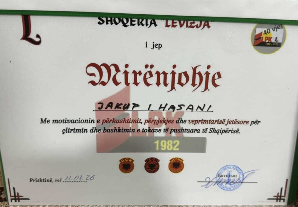 “Lëvizja” dekoron me mirënjohje post mortem Jakup Hasanin