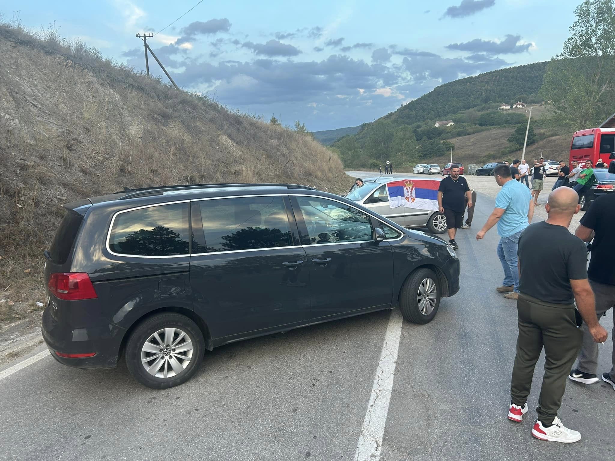 Dy vetura, njëra me një flamur serb në dritaren e pasagjerit, dhe disa persona pranë tyre shihen të vendosur në mes të rrugës që çon në pikën kufitare drejt Kosovës.