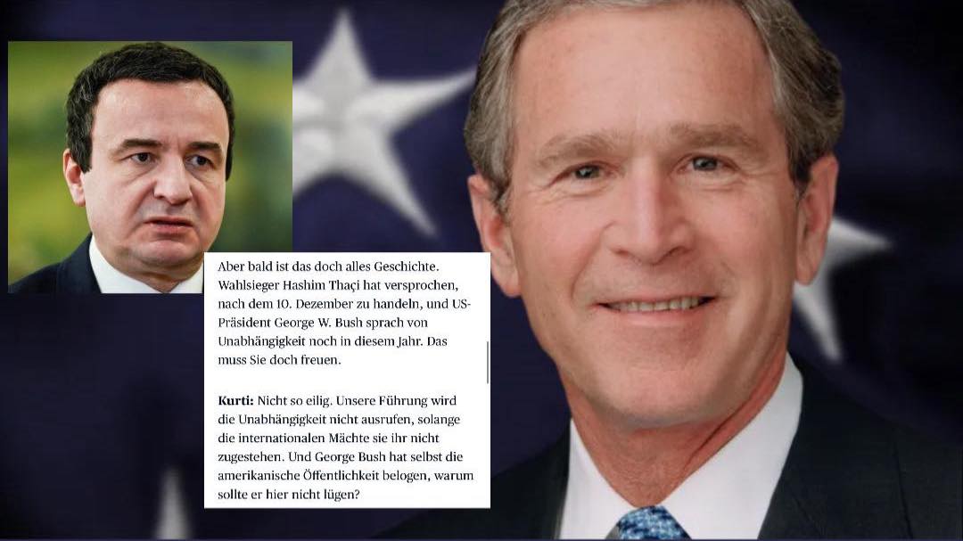 Në pyetjen e mediumit “Die Presse”, se edhe presidenti Bush ka folur për pavarësinë e Kosovës, Kurti e kishte quajtur president gënjeshtar, i cili kur e ka gënjyer publikun amerikan pse mos t’i gënjejë edhe shqiptarët.