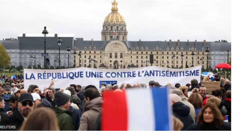 Të dielën pasdite mijëra njerëz dëgjuan thirrjen e kryetarëve të dy dhomave të parlamentit për të treguar mbështetjen e tyre për vlerat “republikane” franceze dhe refuzimin e tyre të antisemitizmit – kjo përballë një rritjeje të madhe të veprimeve antisemitike që nga 7 tetori.