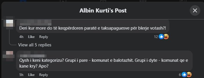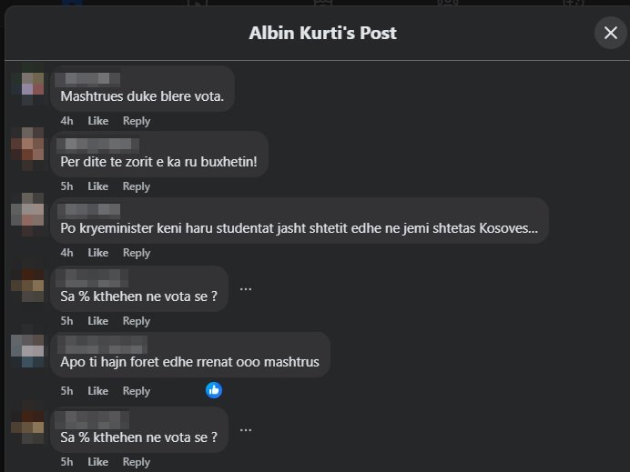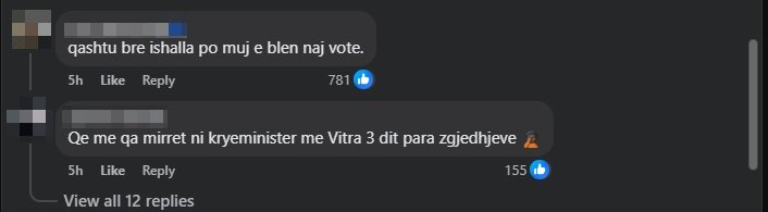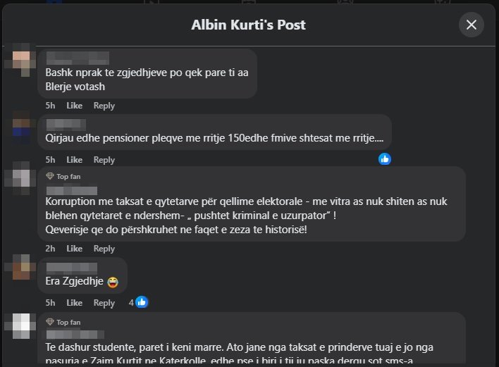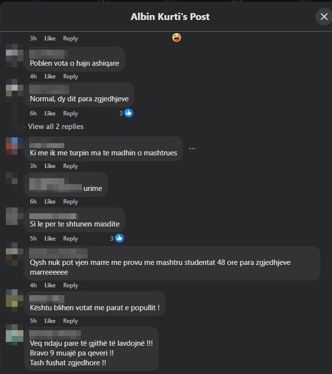 “Sa % kthehen ne vota se?”, “Apo ti hajn foret edhe rrenat ooo mashtrus”, “Jau ke kalu atyne “hajnave” qe i blejshin votat”, “100 euro për me harru 4 vjet dështime?”, “O nale doren kryeminister se boll na nimove… Masi na i ndertove 4 000 banesa, 160 qerdhe, na bane buken ma lire, qumshtin e te gjitha gjerat ushqimore i zbrite, po besa edhe rrymen e zbrite se ato 4000 banesat po rrin mire mbi qymyr. Shko merre familjen nga Norvegjia biri te knaqen me neve, maruen atje te arushat ne Norvegji”.