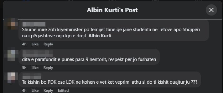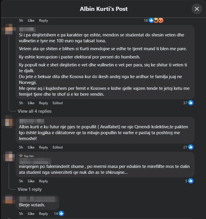 “Korruption me taksat e qytetarve për qellime elektorale – me vitra as nuk shiten as nuk blehen qytetaret e ndershem- „ pushtet kriminal e uzurpator“! Qeverisje qe do përshkruhet ne faqet e zeza te historisë!”, janë vetëm disa nga qindra komentet që Kurti ka marrë në njoftimin për 100 eurot studentore.