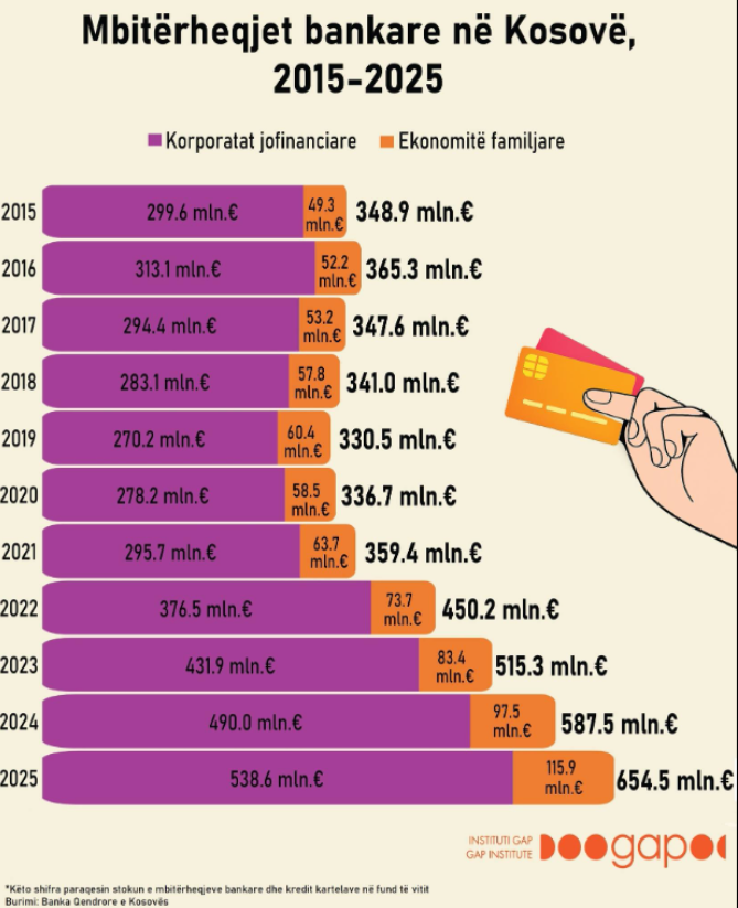 Sipas të dhënave nga Banka Qendrore e Kosovës, të publikuara nga Instituti GAAP, stoku i mbitërheqjeve apo overdrafteve në fund të vitit 2025 ka arritur vlerën prej 655 milionë eurove, një rritje prej 11.4 për qind krahasuar me periudhën e njëjtë të vitit 2024, të publikuara nga Instituti GAP, raporton KosovaPress.