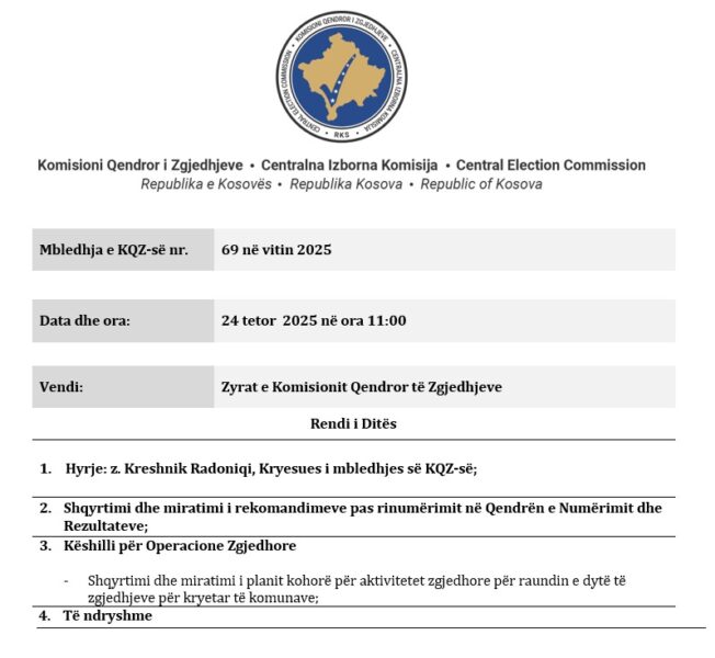Sot, duke filluar nw orwn 11:00, Komisioni Qendror i Zgjedhjeve do të mbajë mbledhjen e radhës dhe pika kryesore në rend të ditës do të jetë miratimi i planit të aktiviteteve për organizimin e raundit të dytë të zgjedhjeve për Kryetarë të Komunave.