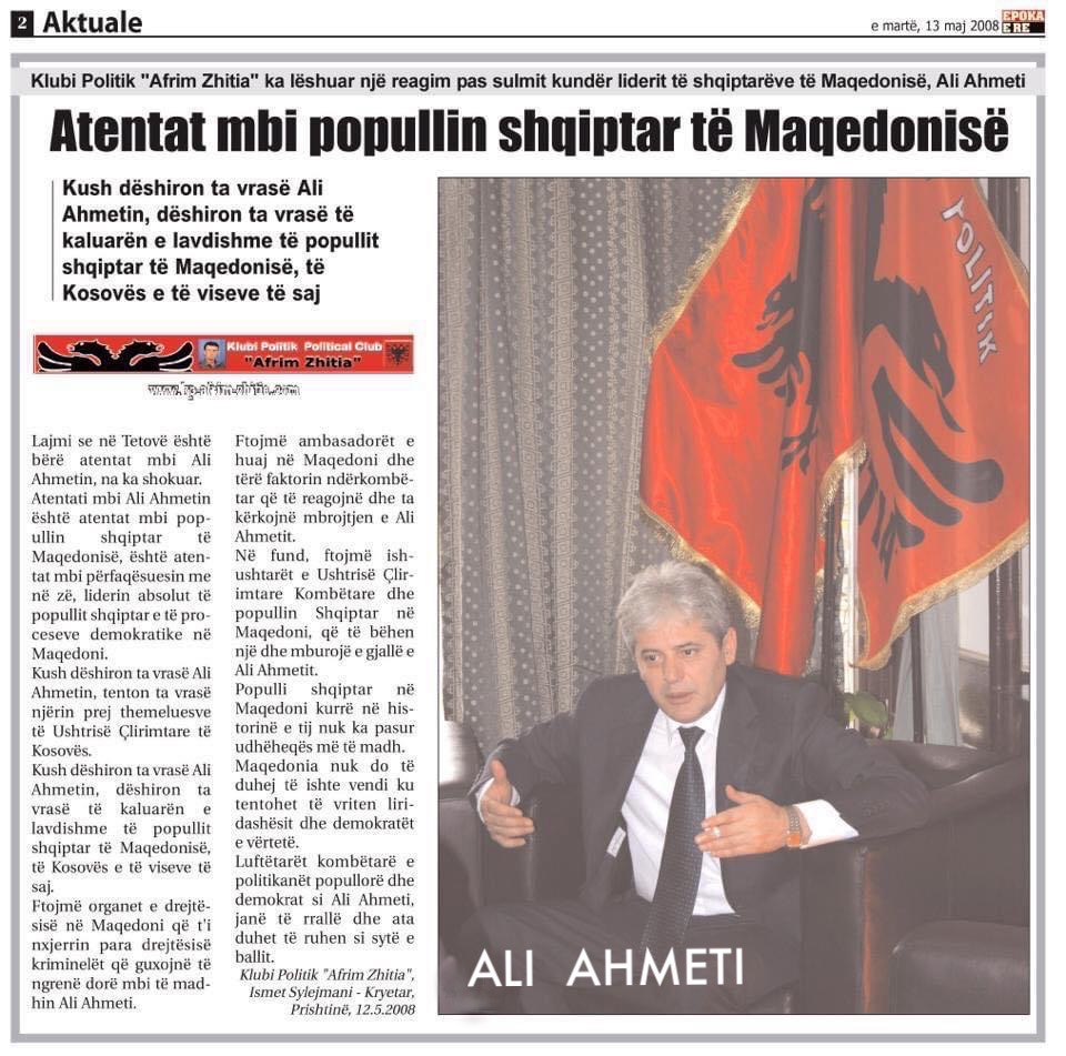 Koha po tregon qartë, se Ali Ahmeti, ky burrë i madh i popullit, Atdheut dhe Kombit, jo vetëm me Ushtrinë e Tij Çlirimtare Kombëtare, që e ka çliruar popullin shqiptar nga dhuna dhe padrejtësitë e shumta me vite që i ishin bërë në Maqedoninë e Veriut, por edhe me Partinë e Tij BDI, po vazhdon, të drejtojë me suksese të mëdha, prandaj i organizuan atentatin atëherë, ngase i ka penguar dhe u pengon fuqia e prezencës së Tij fizike dhe donin që ta vrisnin e ta hiqnin para kohe nga projektet që po realizonte, dhe pas dështimit të atentatit me snajper me shurdhues më 17 Shkurt 2008, në ditën kur Shpallej Pavarësia e Kosovës, pasoi atentati klasik, i cili erdhi disa muaj pas shpalljes së Pavarësisë së Kosovës, dhe është një argument më shumë se sa u ka penguar dhe sa u pengon prezenca e Tij fizike!