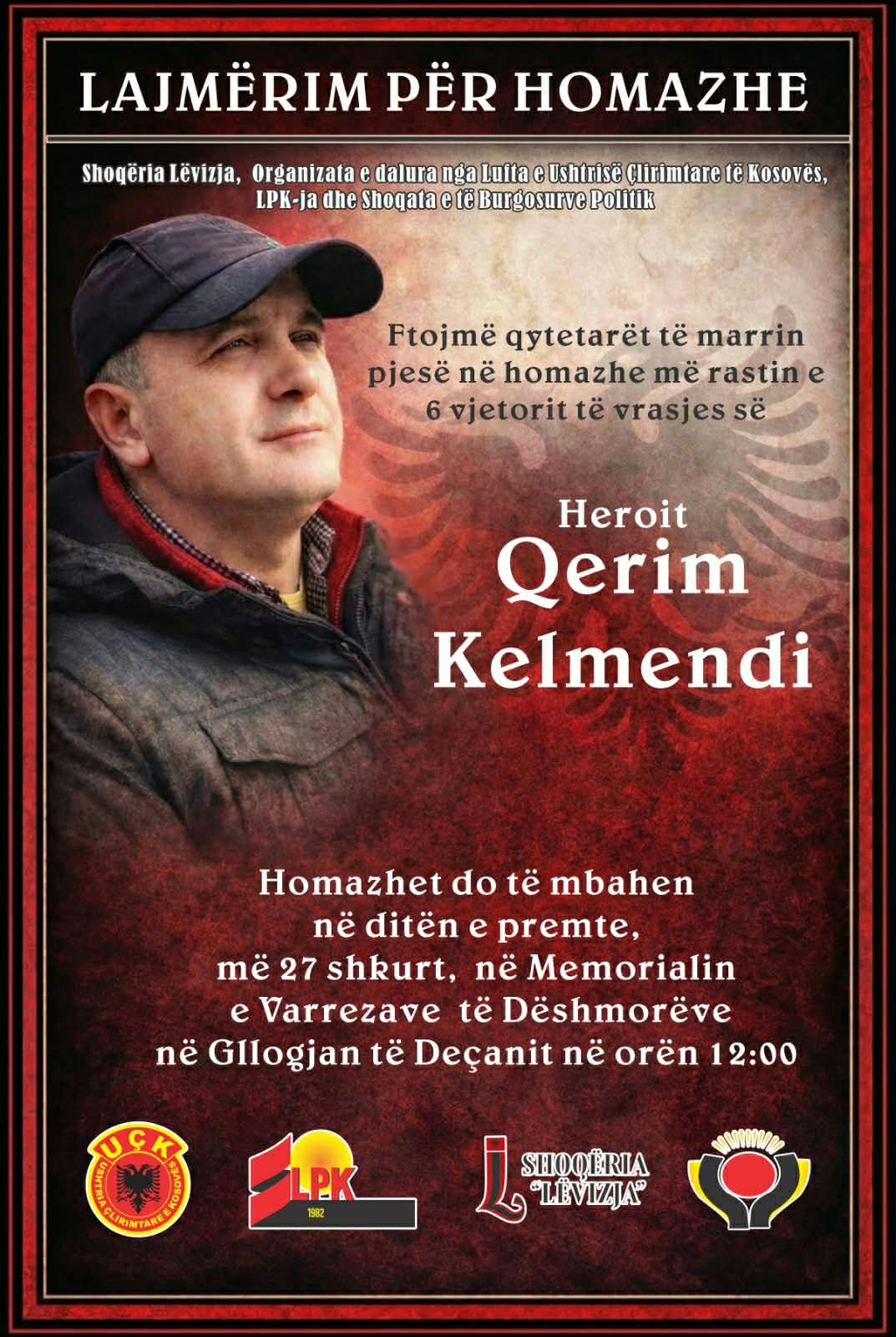 Në nderim të jetës dhe vepres së tij, të premten e 27 shkurtit mbahen homazhe tek varri i Qerim Kelmendit në Memorialin e Varrezave të Dëshmorëve në Gjllogjan të Deçanit, duke filluar në orën 12:00.