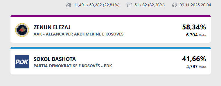 Procesi i numërimit të votave në Klinë ka avancuar në 82 %, dhe rezultati i deritanishëm e vendos në avantazh të dukshëm kandidatin e AAK-së, Zenun Elezaj.