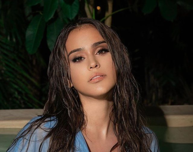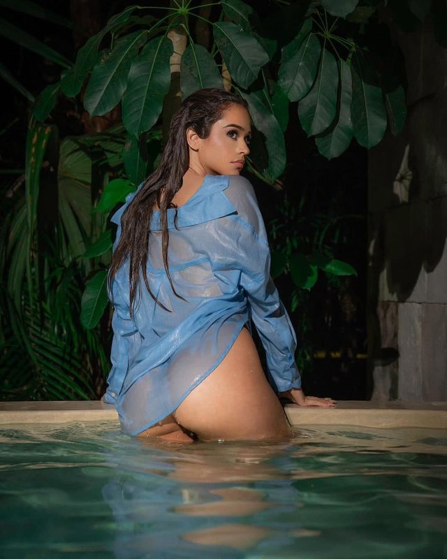 Së fundmi ajo ka publikuar në rrjetet sociale disa foto nga një pishinë, ku shihet e veshur me një këmishë të tejdukshme blu, e cila është e lagur dhe i rri ngjitur pas trupit.