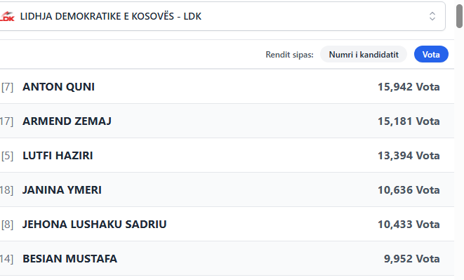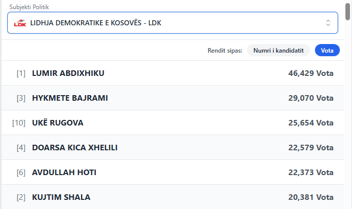 Janë numëruar 60% e votave për deputetë nga radhët e LDK. Prin Lumir Abdixhiku me 46,429 vota. Më pas është Hykmete Bajrami 29,070 dhe Ukë Rugova 25.654 Doarsa Kica-Xhelili aka 22,579,ndërsa Avdullah Hoti 22,737.