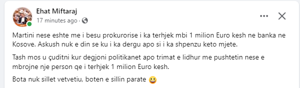“Martini nëse është me i besu prokurorisë i ka terhjek mbi 1 milion Euro kesh ne banka ne Kosove. Askush nuk e din se ku i ka dërgua apo si i ka shpenzua këto mjete. Tash mos u çuditni kur dëgjoni politikanet apo trimat e lidhur me pushtetin nese e mbrojne nje person qe i terhjek 1 milion Euro kesh. Bota nuk sillet vetvetiu, boten e sillin parate”, ka shkruar Miftaraj.