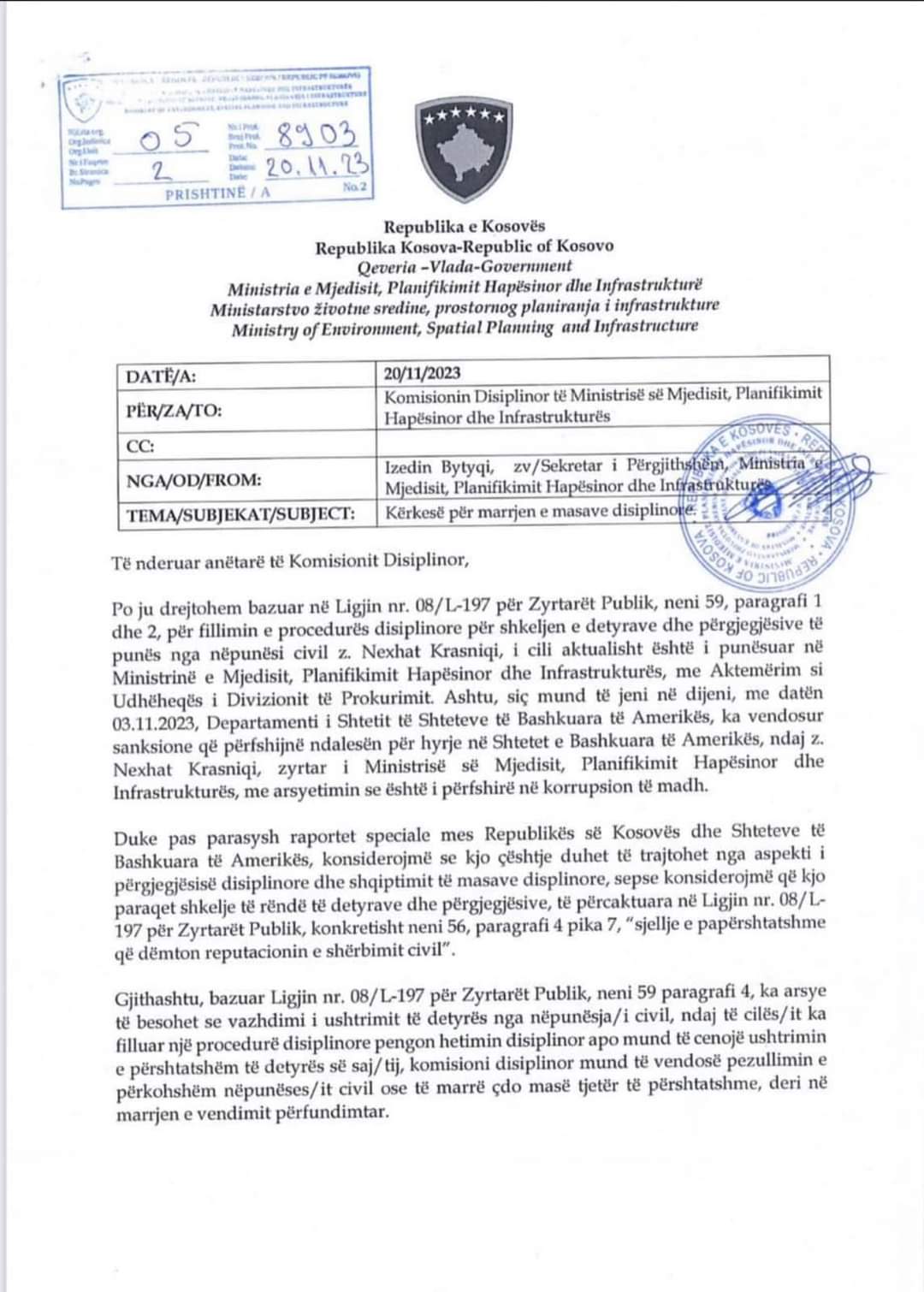 “Përmes zv. Sekretarit të Ministrisë së Mjedisit, Planifikimit Hapësinor dhe Infrastrukturës, dje rreth orës 13:00, kemi dorëzuar tek Komisioni Disiplinor i Ministrisë, kërkesën për marrjen e masave disiplinore ndaj nëpunësit civil, Nexhat Krasniqi”, ka shkruar Aliu.