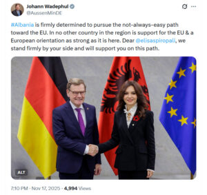 Ministri i Jashtëm gjerman 17 nëntor 2025 | 20:46 Lajme të sponsorizuara Të Fundit 17 nëntor20:52 “Ne nuk ndalemi derisa të vendoset drejtësia”, në Gjakovë protestohet për Daorsën më 23 nëntor 17 nëntor20:51 Shqiptaro-amerikanja uron Hamzën, shpreson që diaspora të jetë më e përfshirë në PDK 17 nëntor20:47 Ministri i Jashtëm gjerman pas vizitës në Shqipëri: Asnjë vend tjetër në rajon s’është i orientuar më fuqishëm drejt BE’së 17 nëntor20:42 A ka vend për Lladrovcin në PDK-në e Hamzës? 17 nëntor20:39 Big Brother VIP Kosova 4 nis sonte – Premtohen drama, emocione dhe surpriza të mëdha! 17 nëntor20:35 Ukraina arrin marrëveshje me Francën për aeroplanë luftarakë
