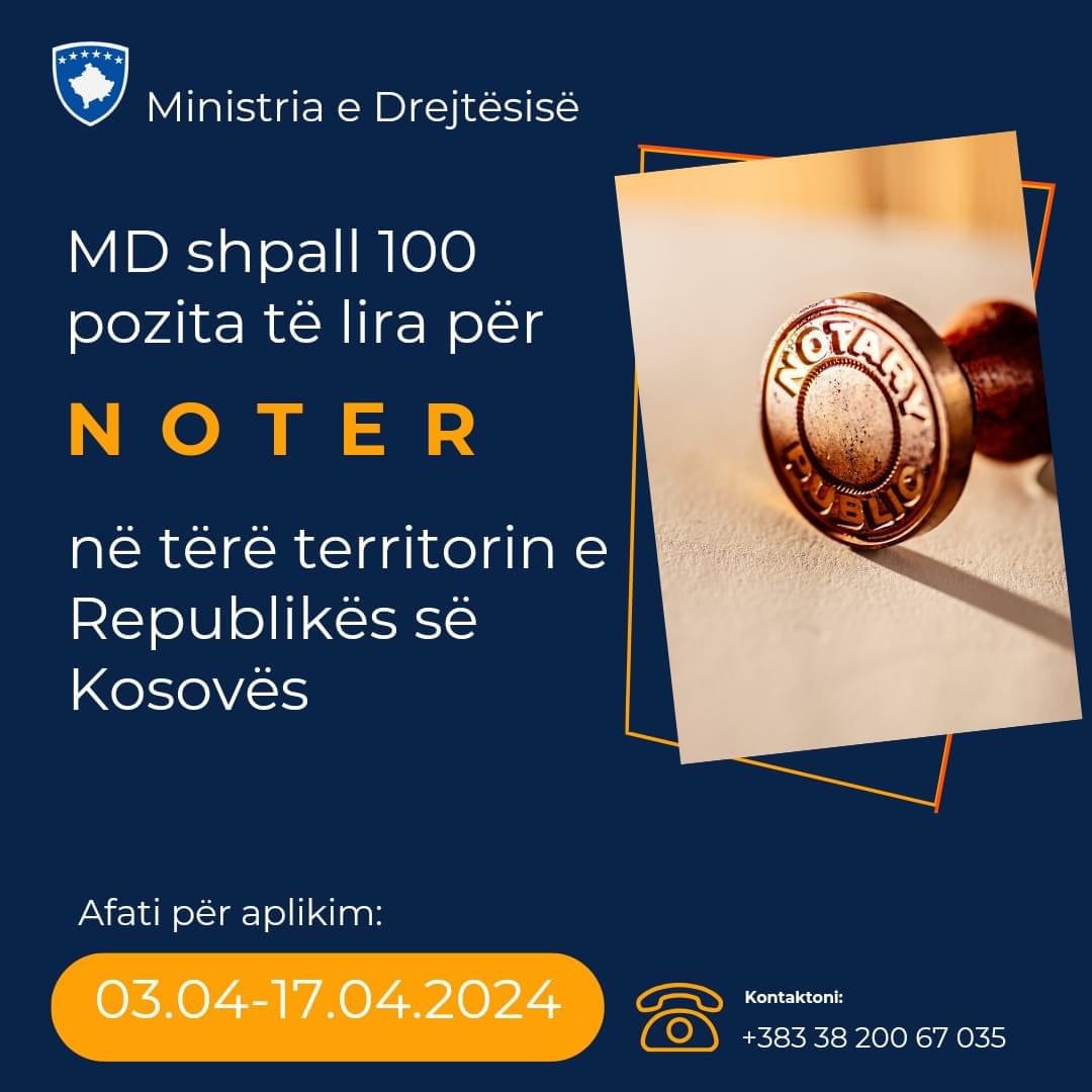 “Njoftohen të gjithë kandidatët e interesuar të cilët dëshirojnë të aplikojnë në konkursin për zgjedhje të noterëve se: Ministria e Drejtësisë shpallë njëqind (100) pozita të lira për NOTER në tërë territorin e Republikës së Kosovës. Afati për dorëzimin e dokumentacionit për aplikim deri më datën 17.04.2024 (e mërkurë). Dokumentacioni për aplikim dorëzohet në Ministrinë e Drejtësisë (ish–Ndërtesa e Rilindjes) kati përdhesë, Arkivi i Ministrisë së Drejtësisë, Prishtinë, Republika e Kosovës, çdo ditë pune nga ora 08:00 deri në ora 16:00. Link: (Konkursi dhe Aplikacioni/Kërkesa) https://md.rks-gov.net/page.aspx?id=1,46”, thuhet në njoftim.