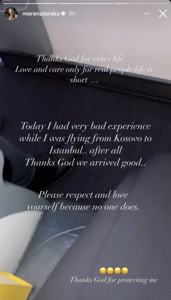 Faleminderit Zotit për jetën tjetër… Duani dhe kujdesuni vetëm për njerëzit e vërtetë sepse jeta është e shkurtër… Sot kisha një përvojë shumë të keqe teksa po fluturoja nga Kosova në Stamboll. Pas të gjithave, faleminderit Zotit arritëm mirë! Ju lutem respektojeni dhe duajeni veten tuaj sepse askush s’e bën këtë për ju. Faleminderit Zot që më mbrojte!