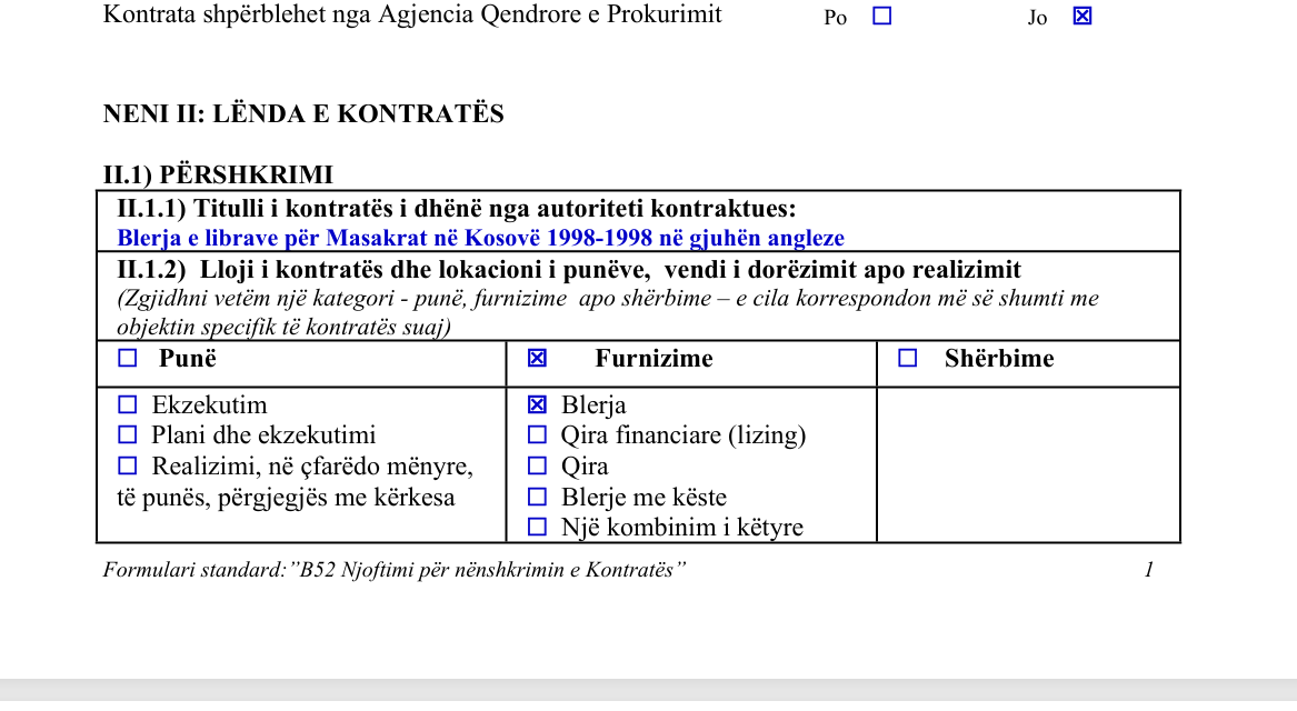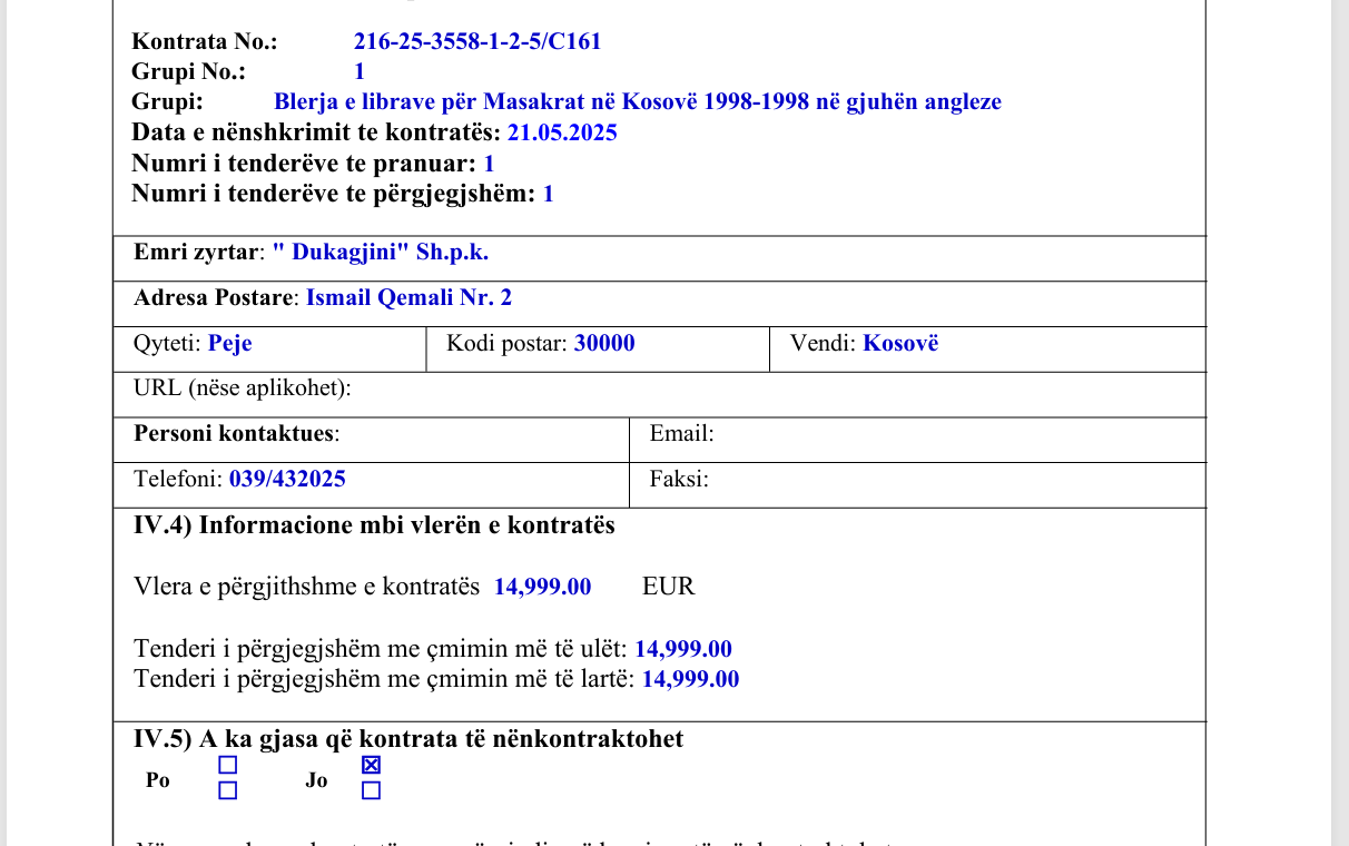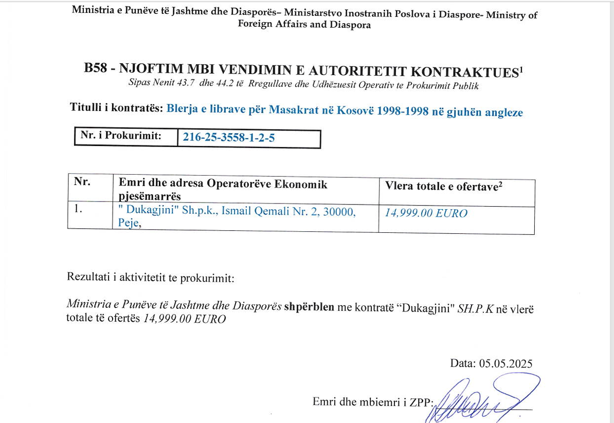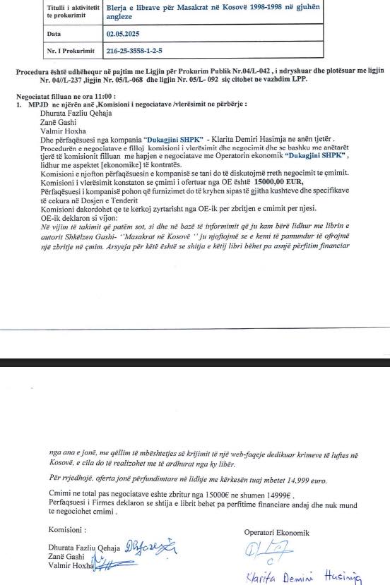 Bazuar në njoftimin e MPJD-së në platformën shtetërore e-prokurimi, një komision vlerësimi i tenderit negocioi vetëm me kompaninë “Dukagjini” për blerjen e 500 kopjeve të librit.