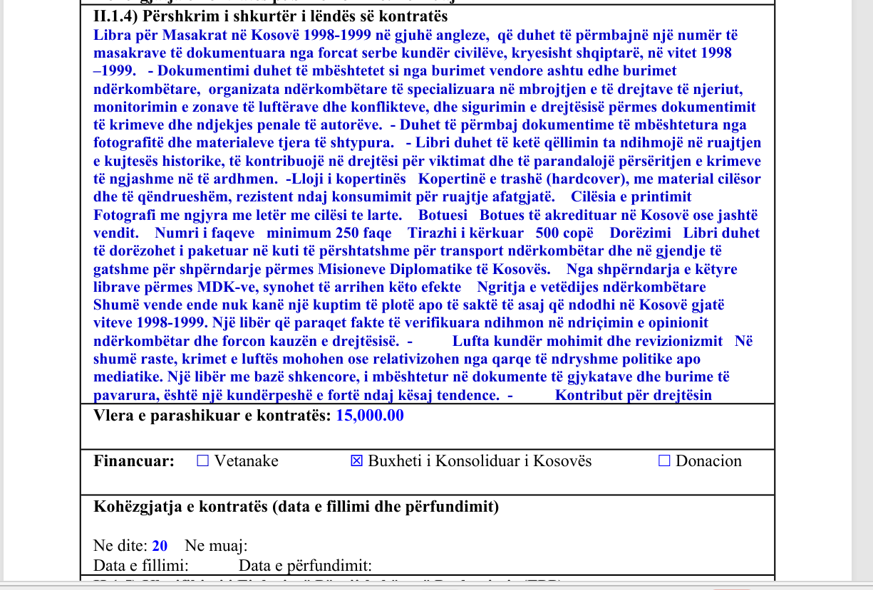 Sipas Dosjes së Tenderit për “blerjen e librave për masakrat në Kosovë 1998-1999 në gjuhën angleze”, MPJD ka caktuar si kriter “një numër të masakrave të dokumentuara nga forcat serbe kundër civilëve, kryesisht shqiptarë, në vitet 1998-1999”.
