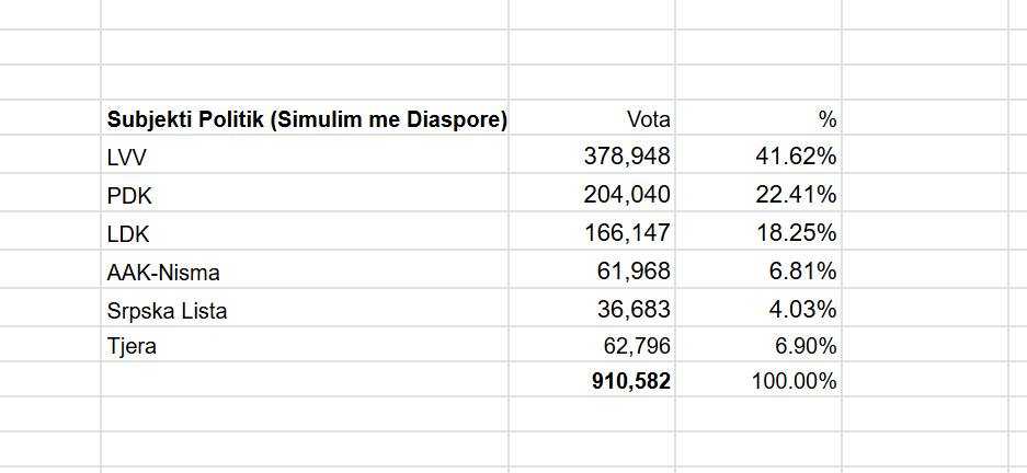 Të dashur, dhjetëra persona më kanë pyetur si dalin rezultatet me diasporën. Sa ndryshon puna? E kam zhvillu një simulim me të dhëna reale me kuptu më mirë. Janë 99% të votave të numëruara nga KQZ. Janë 80k vota nga diaspora. Ju kam alokuar LVV-së 50% e PDK 25% dhe LDK 25%. Rezultatet finale simuluese janë:
