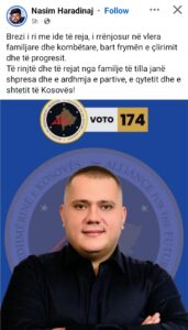 Nasim Haradinaj, ish kryetar i OVLUÇK-së, përmes një postimi në “Facebook” i ka dhënë përkrahje kandidaturës se Edon Hysenajt – AAK, në garën për asamble në Pejë, me numrin 11.