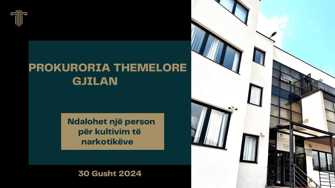 Prokuroria Themelore në Gjilan, me urdhër të prokurorit kujdestar të Departamentit të Krimeve të Rënda, ka ndaluar të dyshuarin E.A., në kohëzgjatje prej 48 orëve, për shkak të dyshimit se ka kryer veprën penale “Kultivimi i bimës së hashashit, shkurres së kokainës ose bimëve të kanabisit”, të Kodit Penal të Republikës së Kosovës.