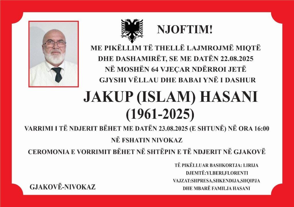 Ka ndërruar jetë në moshën 64-vjeçare, pas një sëmundjeje të shkurtër por të rëndë, mërgimtari Jakup Hasani, i cili jetonte në Zvicër së bashku me familjen e tij.