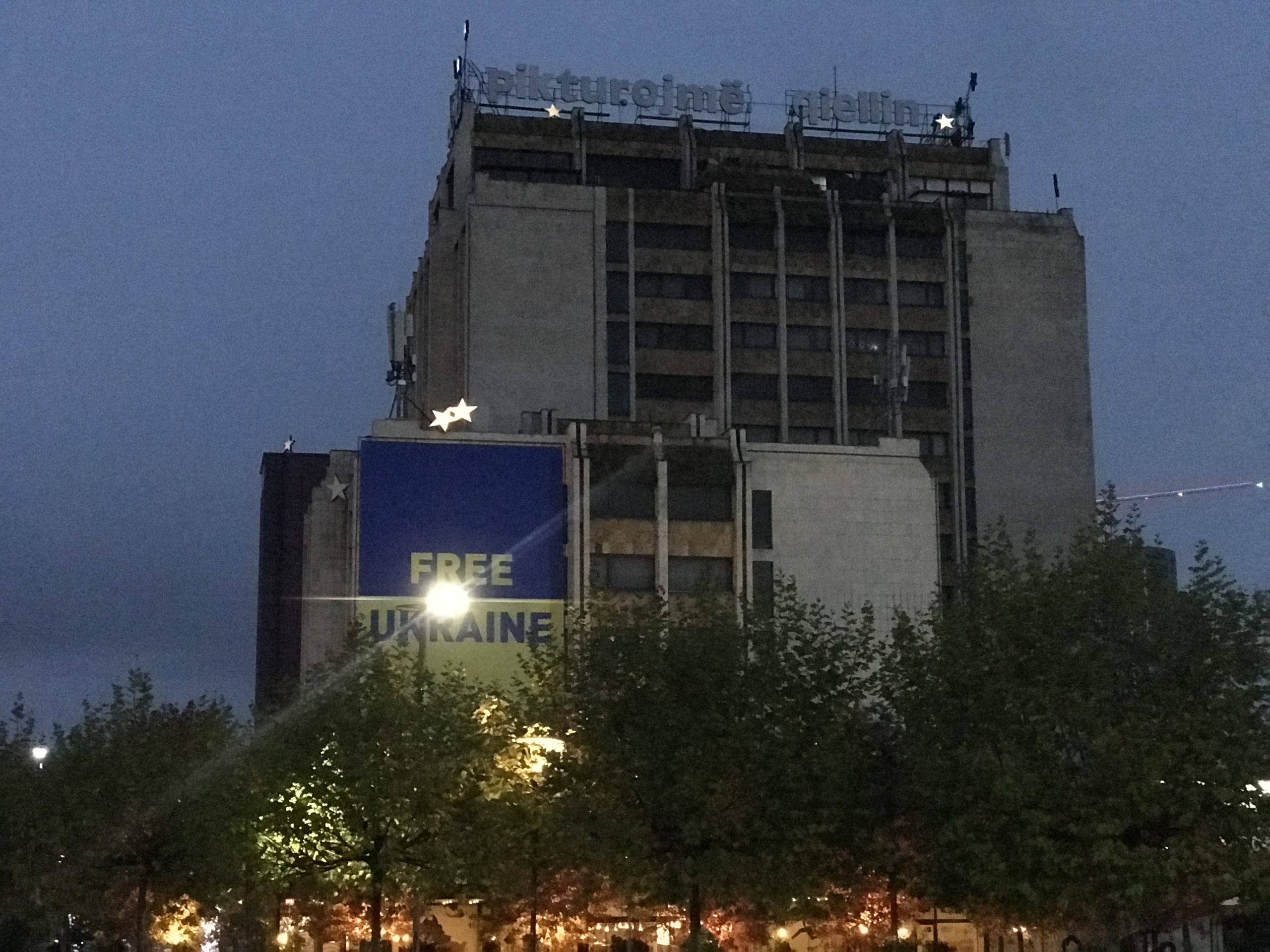 Në ndërtesën e hotel Grandit në Prishtinë, është Flamuri i Ukrainës dhe nuk ka asgjë tjetër.