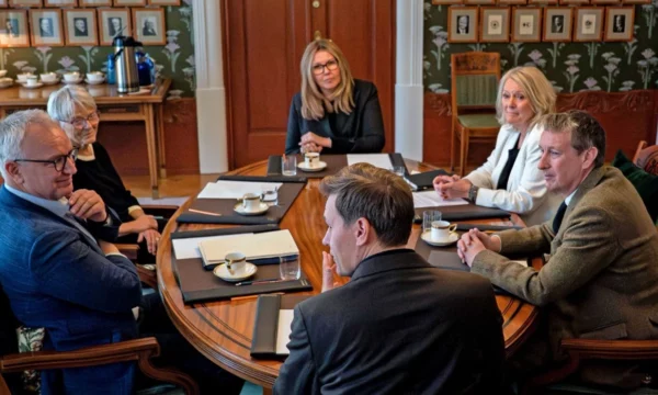 Pesë anëtarët dhe sekretari takohen në sallën e Komitetit të institutit Nobel të Oslos.