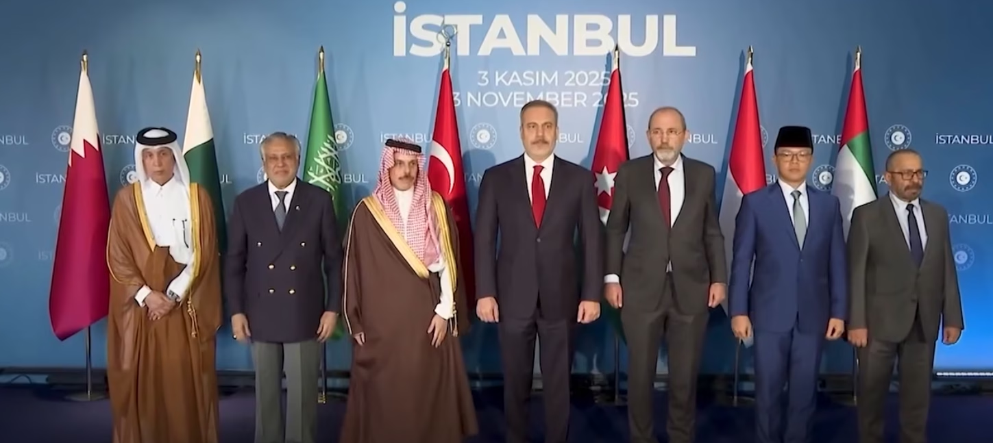 Para takimit, Fidan pozoi për një foto familjare me ministrin e Jashtëm indonezian Sugiono, ministrin e Jashtëm pakistanez Mohammad Ishaq Dar, ministrin e Jashtëm Saudit Faisal bin Farhan Al Saud, ministrin e Jashtëm jordanez Ayman al-Safadi dhe përfaqësues të Emirateve të Bashkuara Arabe dhe Katarit.