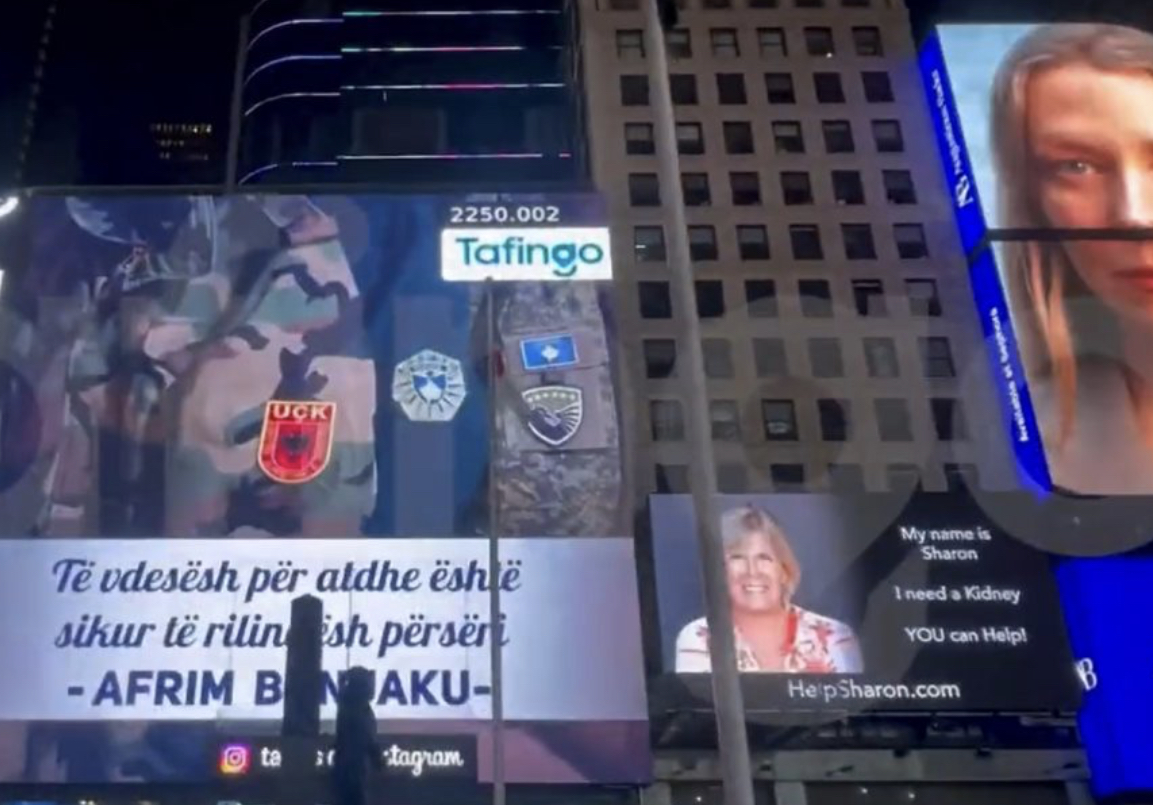 Në ‘Times Square’ në Nju-Jork shfaqet logoja e UÇK-së dhe policisë, nderohet polici Afrim Bunjaku
