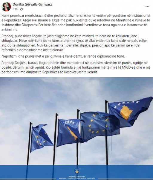 Gërvalla ka thënë se të gjitha emërimet dhe shkarkimet nga ministria që ajo drejton janë bërë në bazë të “meritokracisë dhe profesionalizmit”.