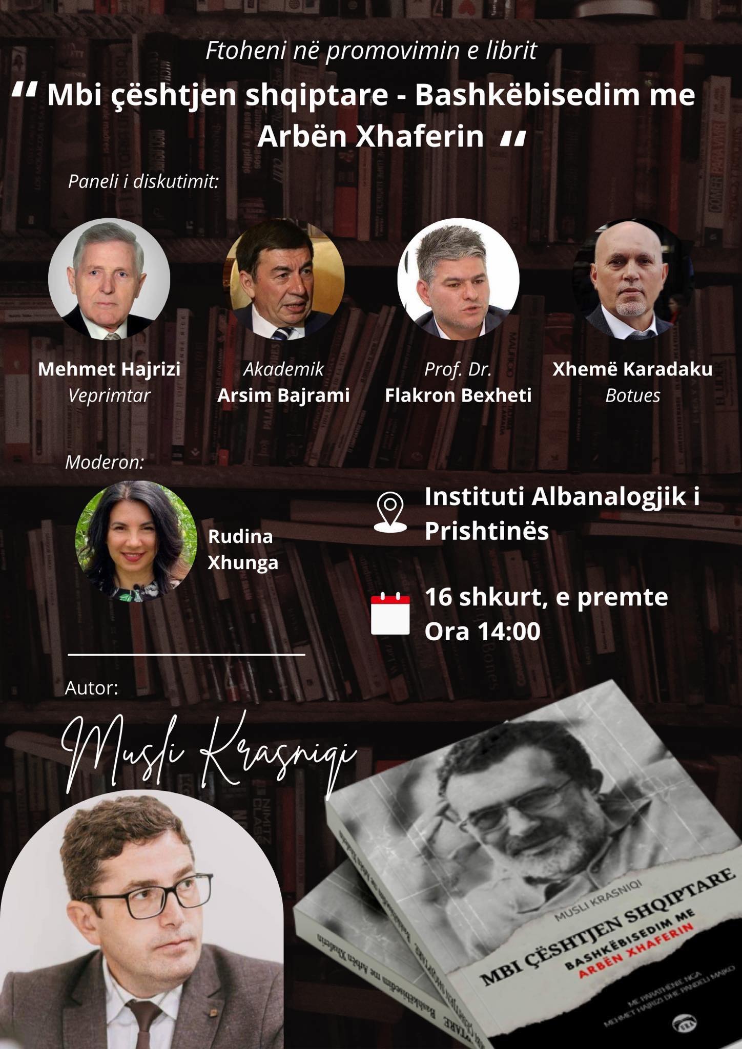 Nesër në Institutin Albanologjik të Prishtinës, në orën 14:00, promovohet libri “Mbi çështjen shqiptare – bashkëbisedim me Arbën Xhaferin”, i autorit Musli Krasniqi.