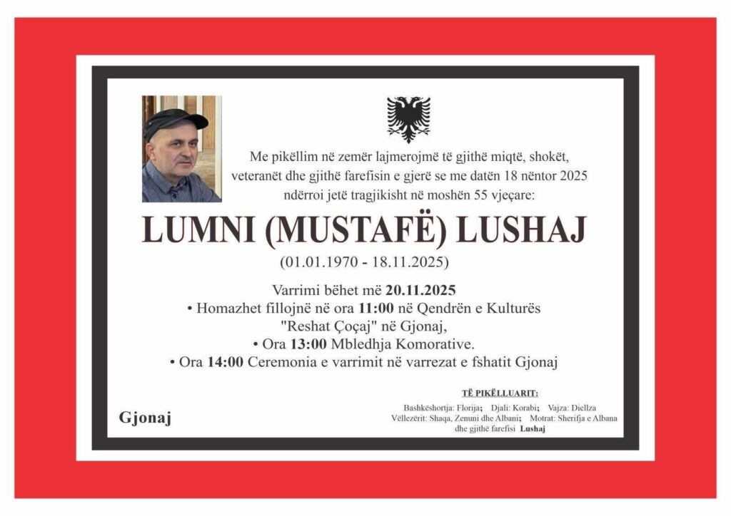 Varrimi i të ndjerit Lumni Lushaj do të bëhet nesër, të enjten, më 20.11.2025.