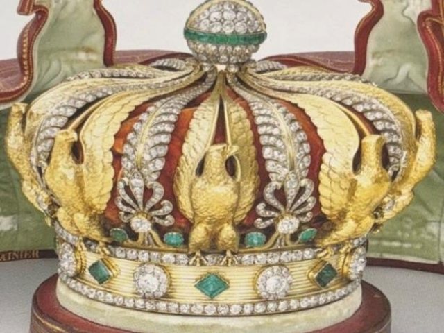 “Kurora e mbyllur me shqiponja dhe diamante u krijua nga argjendari Lemonnier duke përdorur 102 diamante me një total prej 32 karatësh, të cilat perandori ia dhuroi argjendarit në vitin 1855 dhe të cilat më parë ishin montuar në bizhuteri në Thesarin Mbretëror të Francës. Ato nuk ishin të mjaftueshme, kështu që argjendari shtoi më shumë diamante, të cilat, së bashku me arin dhe smeraldet, lejuan krijimin e kurorës së mbyllur. Një xhevahir i mbajtur për shekuj me radhë në kutinë e tij origjinale, e cila pasqyronte formën e tij.”