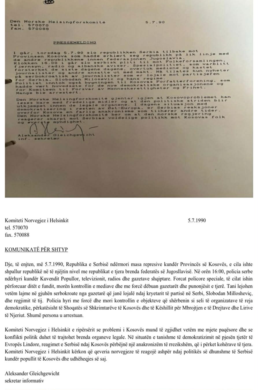 Gjithashtu në vijim paraqitet faksimili i një komunikate për shtyp, menjëherë pas Deklaratës së 2 korrikut 1990, nga Aleksander Gleichgewicht, një ndër disidentët e lëvizjes polake Solidarnost, sekretar për informim në Komitetin Norvegjez të Helsinkit dhe mbështetës i Lëvizjes për Republikën e Kosovës. Kjo deklaratë, e pa publikuar deri më tani në mediat sociale dhe në shtypin e shkruar, më poshtë është përkthyer nga origjinali në norvegjisht në shqip.