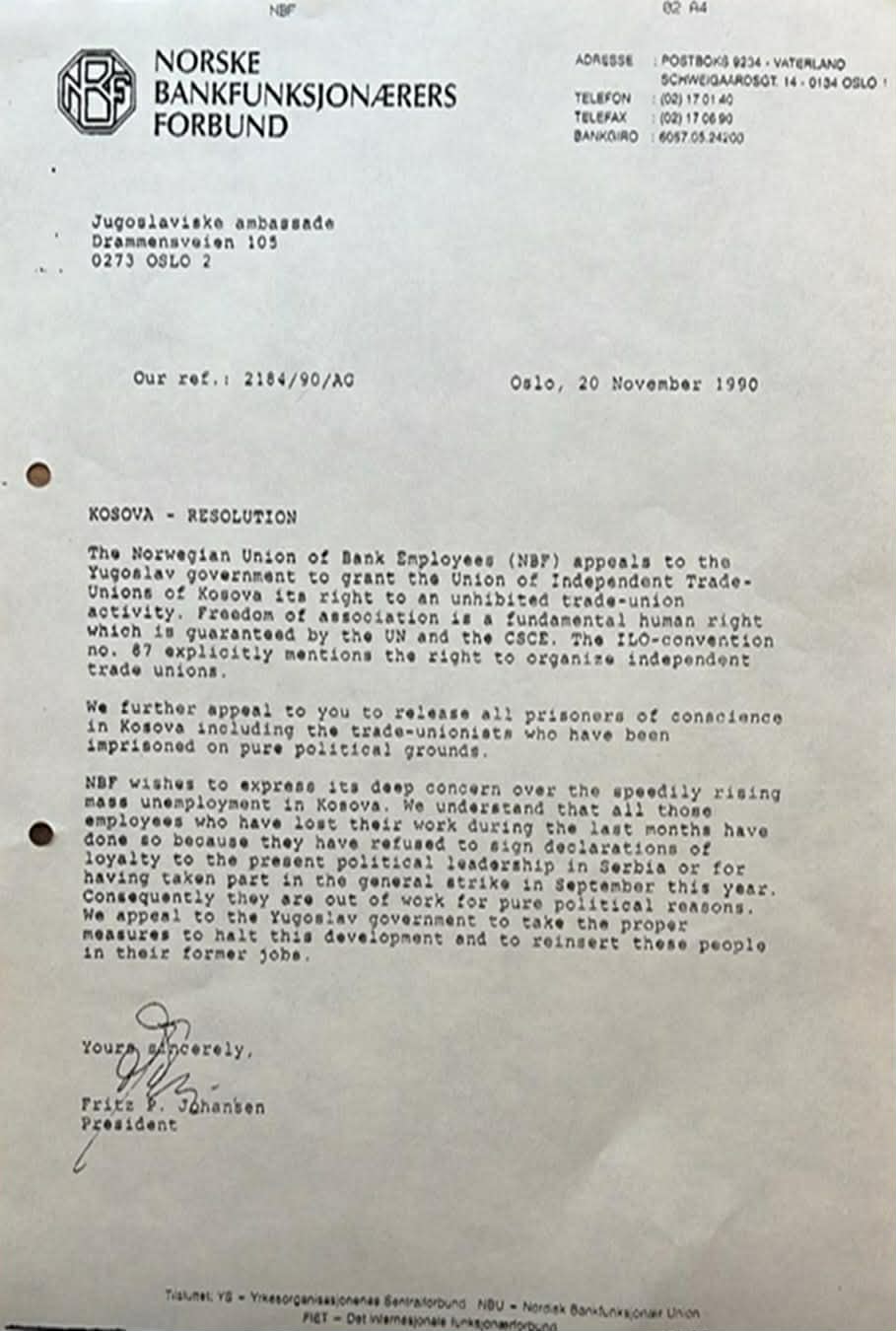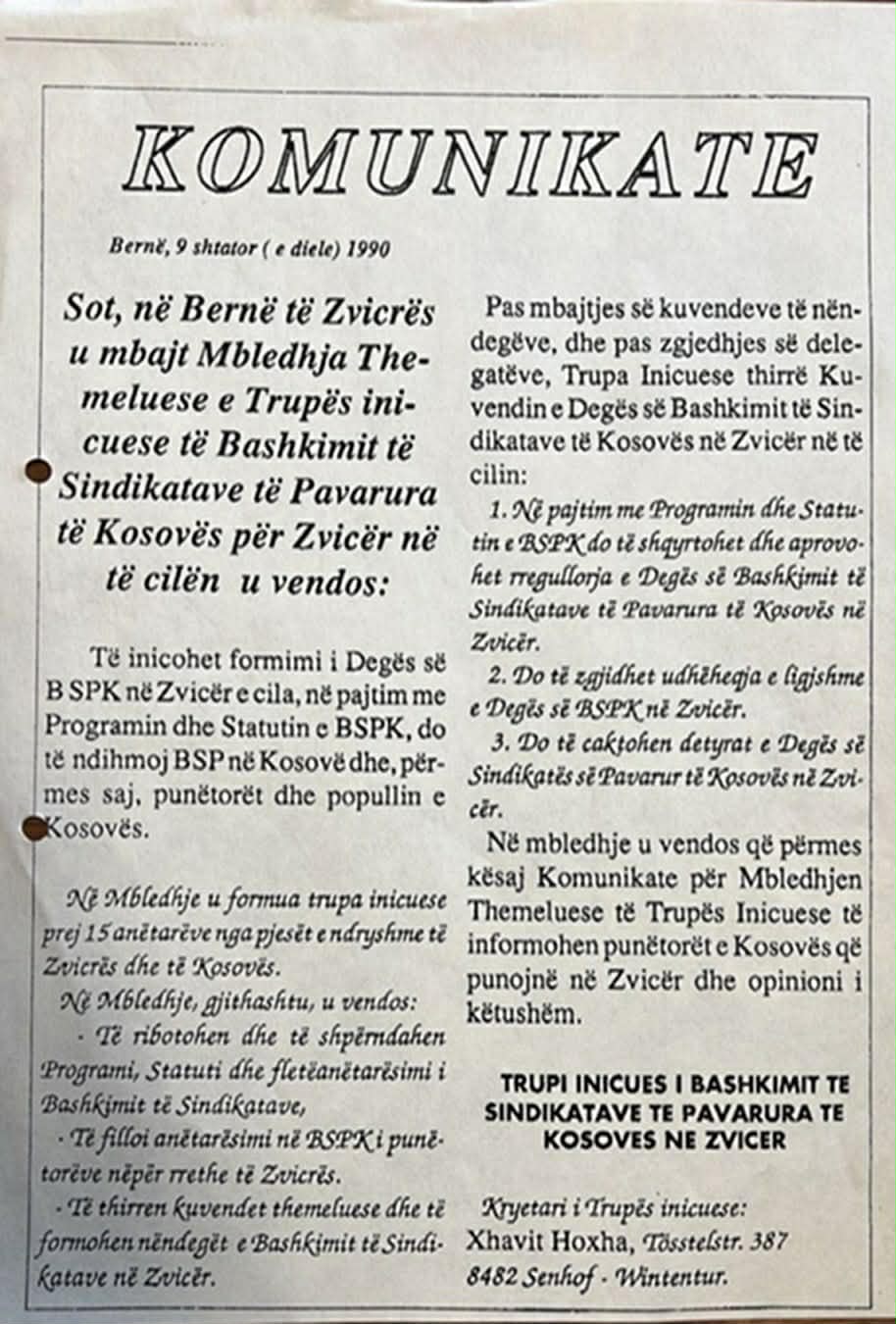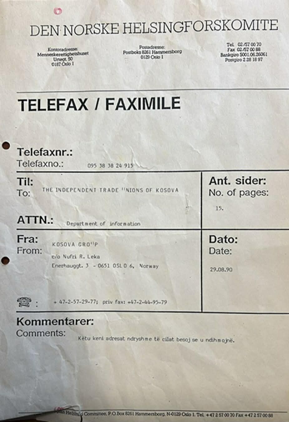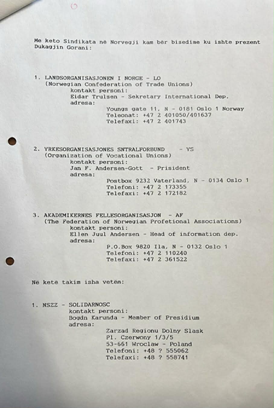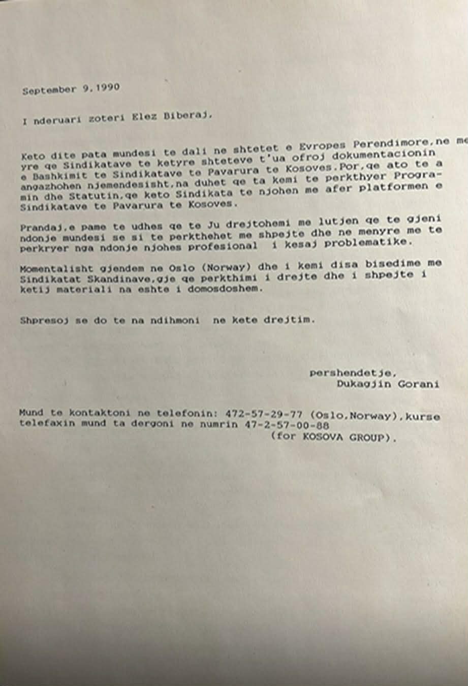 Më tutje në vijim paraqiten gjashtë faksimile, të pa publikuara deri më tash. Faksimilja e parë përmban korrespondencën me faks të datës 29 gusht 1990, ndërmjet përgjegjësit të Grupit për Kosovën, në kuadër të Komitetit Norvegjez të Helsinkit (GKKNH), dhe Bashkimit të Sindikatave të Pavarura të Kosovës (BSPK) në krye me Hajrullah Goranin. Faksimilja e dytë është komunikata e datës 9 shtator 1990, e trupës iniciuese në Zvicër e udhëhequr nga Xhavit Hoxha, në lidhje me bashkimin e sindikatave të pavarura të Kosovës. Faksimilja e tretë përmban një informim të përgjegjësit të GKKNH-së lidhur me takimet e zhvilluara me sindikatat në Norvegji, të realizuara së bashku me Dukagjin Goranin, si dhe për një takim të veçantë të përfaqësuesit të GKKNH-së me një nga përfaqësuesit kryesorë të sindikatave të Lëvizjes Solidarnost. Faksimilja e katërt është letra e Dukagjin Goranit drejtuar Elez Biberajt, në të cilën përfshihet edhe referenca për vendosjen e kontaktit me Grupin për Kosovën në kuadër të Komitetit Norvegjez të Helsinkit. Faksimilja e pestë përbën një njoftim orientues dhe inkurajues të përgjegjësit të GKKNH-së, drejtuar shqiptarëve në Norvegji, me qëllim mobilizimin e tyre për të mbështetur BSPK-në. Ndërkaq, faksimilja e gjashtë paraqet një letër proteste kundër autoriteteve serbo-jugosllave, të hartuar nga njëra prej organizatave sindikaliste të Norvegjisë dhe të dërguar Ambasadës jugosllave në Oslo (Norvegji). Në këtë dokument, ndër të tjera, duke iu referuar OKB-së, KSBE-së dhe Konventës nr. 87 të ONP-së, kërkohet garantimi i të drejtave për organizimin e sindikatave të pavarura në Kosovë dhe dënohen burgosjet me motiv politik.
