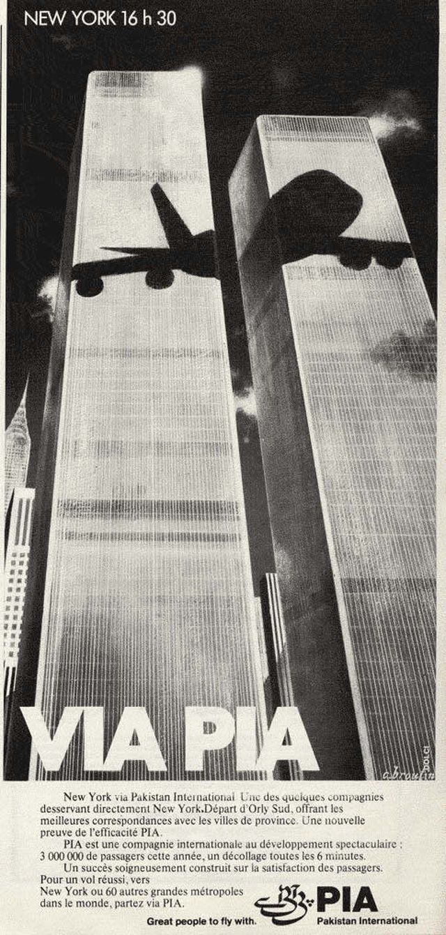 Disa përdorues të mediave sociale kanë pretenduar se PIA kishte një reklamë në vitin 1979 që tregonte hijen e një avioni pasagjerësh mbi Kullat Binjake në Nju Jork, sipas BBC.