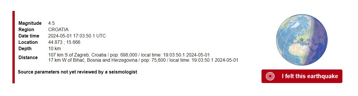 Epiqendra e tij ishte n17 km larg Bihac, dhe 107 km larg kryeqytetit Zagreb.