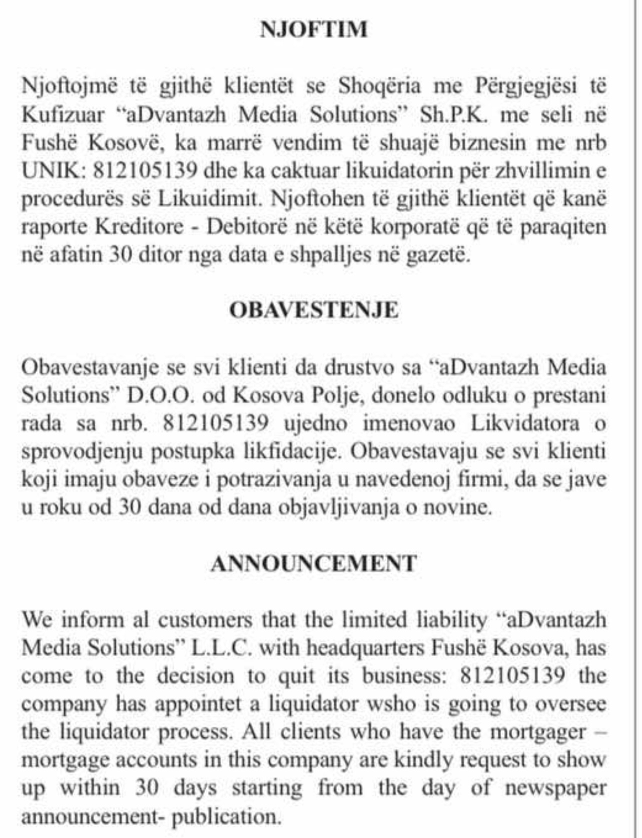 Njoftim për shuarje biznesi nga “aDvantazh Media Solitions” 30 janar 2024 | 16:48 Lajme të sponsorizuara Të Fundit 31 tetor13:10 Shpallje e pavlefshme nga Blerim Xhemali 31 tetor12:37 Shpallje nga Dodë Lleshi 30 tetor18:46 Shpallje e pavlefshme nga ROGOZNA TOP KARE 30 tetor13:39 Shpallje e pavlefshme nga “Antaura” SH.P.K. 29 tetor14:27 Shpallje e pavlefshme nga Besart Krasniqi 29 tetor14:26 Shpallje e pavlefshme nga Agnesa Shala