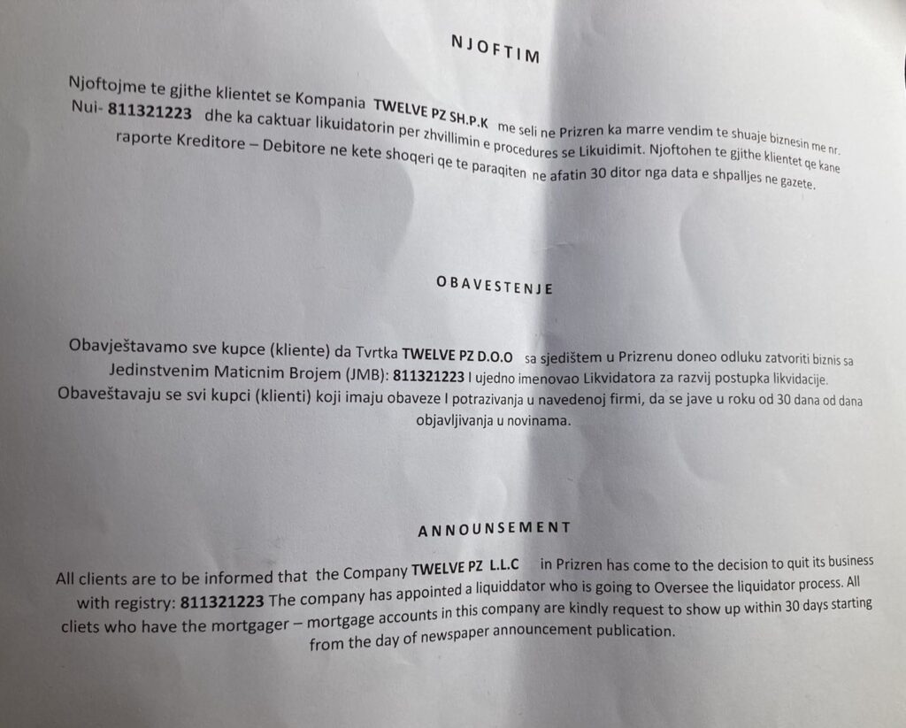 Njoftim për shuarje biznesi nga “TWELVE PZ” SH.P.K 11 maj 2024 | 23:43 Lajme të sponsorizuara Të Fundit 24 prill14:48 Shpallje nga Liridon Shala 24 prill14:46 Shpallje nga Fatjon Rexhaj 24 prill13:30 Zvogëlim kapitali nga “Prime Invest Group” 23 prill17:16 Shpallje e pavlefshme nga Liridoni Kuliqi 23 prill14:23 Shpallje nga Gani Musaj 23 prill14:22 Shpallje nga Albiona Totaj
