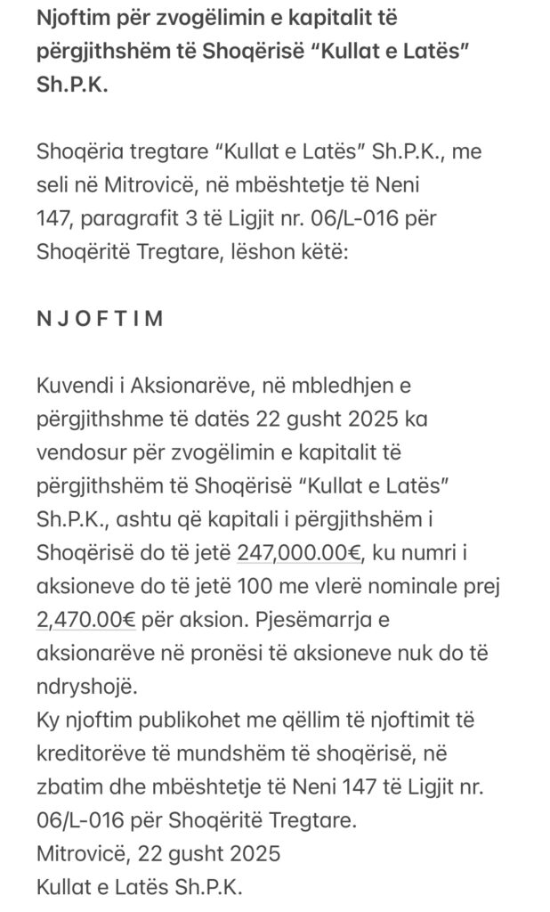 Njoftim për zvogëlimin e kapitalit të përgjithshëm të Shoqërisë “Kullat e Latës” Sh.P.K 25 gusht 2025 | 08:23 Lajme të sponsorizuara Të Fundit 05 dhjetor13:21 Shpallje nga Vedat Hasani 05 dhjetor12:17 Shpallje e pavlefshme nga Valentina Gashi 04 dhjetor14:34 Shpallje e pavlefshme nga D.P.T. “Pelikan” Blerimm Lladrovci B.I 04 dhjetor13:49 Shpallje nga Donjeta Vehapi 04 dhjetor13:48 Shpallje nga Selman Dodaj 04 dhjetor11:47 Shpallje nga Regan Nezaj