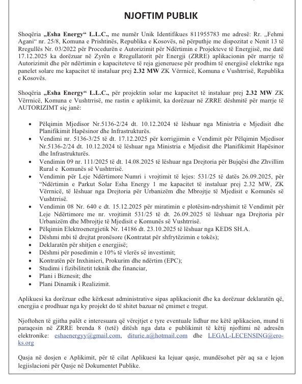 Njoftim Publik nga “Esha Energy” 25 dhjetor 2025 | 15:40 Lajme të sponsorizuara Të Fundit 25 dhjetor15:40 Njoftim Publik nga “Esha Energy” 25 dhjetor15:39 Njoftim Publik nga “Esha Energy” L.L.C 25 dhjetor15:36 Njoftim Publik nga “Mdynamic Solutions” 24 dhjetor17:17 Shpalje e vogel nga Florim Ferati 24 dhjetor15:29 Shpallje e pavlefshme nga Royal Travel Group Hajj&Umrah L.L.C 24 dhjetor14:35 Shpallje e pavlefshme nga Blerina Haxhidauti