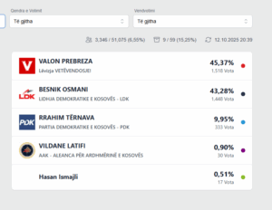 fushe-kosove 12 tetor 2025 | 21:14 Lajme të sponsorizuara Të Fundit 12 tetor21:20 Prokurori i Shtetit: Vetëm dy raste me elemente të veprave penale kundër të drejtave të votimit 12 tetor21:18 Kush po prinë me vota në Klinë? 12 tetor21:15 Numërohen 20 përqind e votave, kjo është situata në Fushë Kosovë 12 tetor21:11 Hajdari: Balotazh ka, në balotazh e mundim pa miliona 12 tetor21:08 Me tupana e surle – nis festa në selinë e LDK-së në Prishtinë 12 tetor21:05 Gara ende s’ka përfunduar, Rama reagon pasi doli i pari në Prishtinë: Faleminderit nga zemra