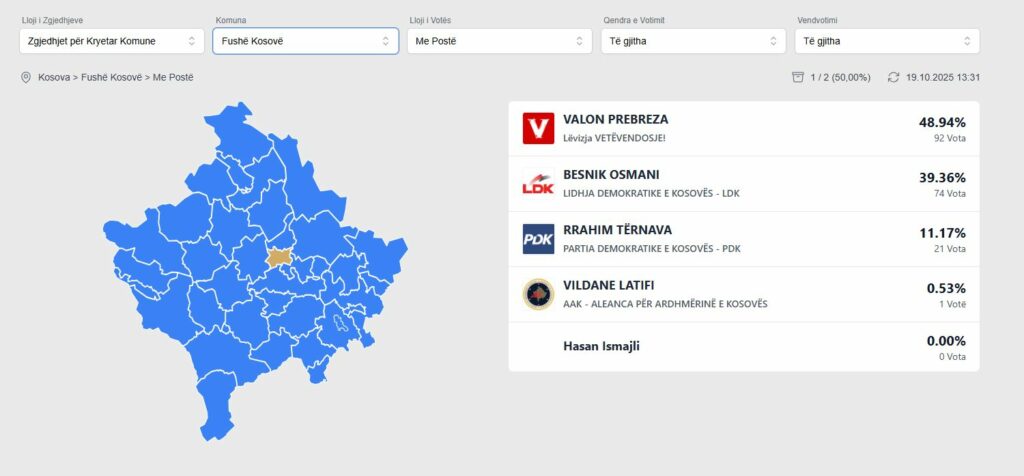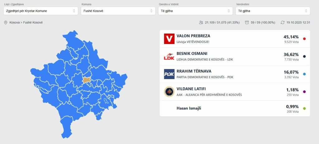 Edhe nga rezultatet preliminare të Komisionit Qendror të Zgjedhjeve, Prebreza udhëheq në Fushë Kosovë me 45.14%, derisa Osmani radhitet i dyti me 36.62%.