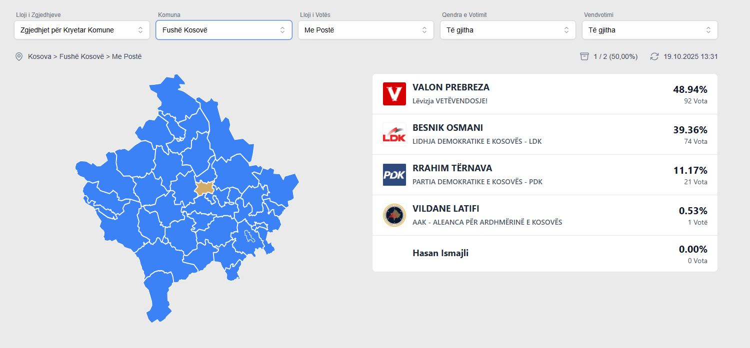 Valon Prebreza nga Lëvizja Vetëvendosje ka marrë 48.94% të votave, derisa Besnik Osmani i Lidhjes Demokratike të Kosovës ka grumbulluar 39.36%.