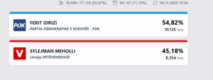 vushtrri-768×290 09 nëntor 2025 | 20:08 Lajme të sponsorizuara Të Fundit 09 nëntor20:14 Garë e nxehtë mes Përparim Ramës e Hajrulla Çekut, kaq vota kanë diferencë deri tani 09 nëntor20:10 Numërohen 72% e votave në Vushtrri, ky është rezultati 09 nëntor20:00 Bedri Hamza: Rezultat i ngushtë, të presim deri të hënën 09 nëntor19:48 Krasniqi thumbon VV`në për Gjilanin: Edhe këta duhet me fitu diçka 09 nëntor19:47 “LUJTA O RAMIZ”: Muharremaj telefonon LIVE Lladrovcin 09 nëntor19:44 Hisen Berisha: Ekziston rreziku që rezultati zgjedhor i Arian Tahirit si fitues të manipulohet