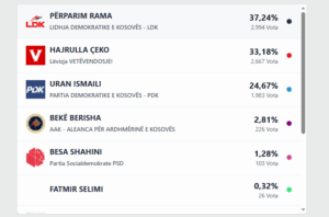 Capture 12 tetor 2025 | 21:22 Lajme të sponsorizuara Të Fundit 12 tetor21:39 “Fluturon” me vota PDK-ja në Ferizaj, VV-ja mbetet shumë mbrapa 12 tetor21:25 Ramiz Lladrovci: Nëse fitoj sonte, nesër jam në zyre të PDK-së – Jam shef i partisë në Drenas 12 tetor21:24 Numërohet afro 11% e kutive në Prishtinë, Rama ende i pari 12 tetor21:20 Prokurori i Shtetit: Vetëm dy raste me elemente të veprave penale kundër të drejtave të votimit 12 tetor21:18 Kush po prinë me vota në Klinë? 12 tetor21:15 Numërohen 20 përqind e votave, kjo është situata në Fushë Kosovë