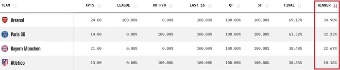 Menjëherë pas tyre vjen Paris Saint-Germain, që mban mbi 32% mundësi për të ngritur trofeun lartë, duke konfirmuar formën dhe rrugëtimin e fortë deri në këtë fazë.