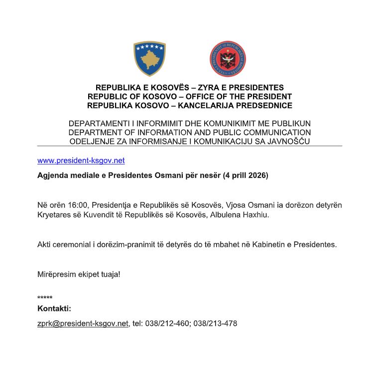 Kjo u bë e ditur në komunikatën për media nga Zyra e Presidentes.