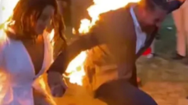 Pamjet e shpërndara në rrjete sociale shfaqin çiftin të kapluar nga zjarri, i cili filloi nga buqeta e luleve dhe më pas u përhap në kurrizin e të dyve.