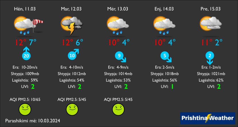 “Indeksi mbetet më gjatë në vlera të pranueshme. Vetëm orëve të mbrëmjes vende-vende mund të ketë rritje të koncentrimeve të ndotësve, që çojnë indeksin edhe në vlera të dobëta të ndotjes”. 11.03 – Kryesisht me vranësira dhe erë të fuqishme jugore. Nga mesdita priten të reshura shiu, që vijnë duke u intensifikuar gjatë mbrëmjes. 12.03 – Vranësira të ndryshueshme dhe intervale me diell. Pasdite priten rrebeshe shiu dhe bubullima. 13.03 – Vranësira e diell. Pasdite mundësi për riga lokale shiu. 14.03 – Intervale me diell dhe vranësira, me mundësi për riga lokale shiu pasdite. 15.03 – Vranësira të ndryshueshme dhe intervale me diell. Shtypja atmosferike me tendencë të rritjes pas rënies në fillim të javës”, ka njoftuar Prishtina Weather.