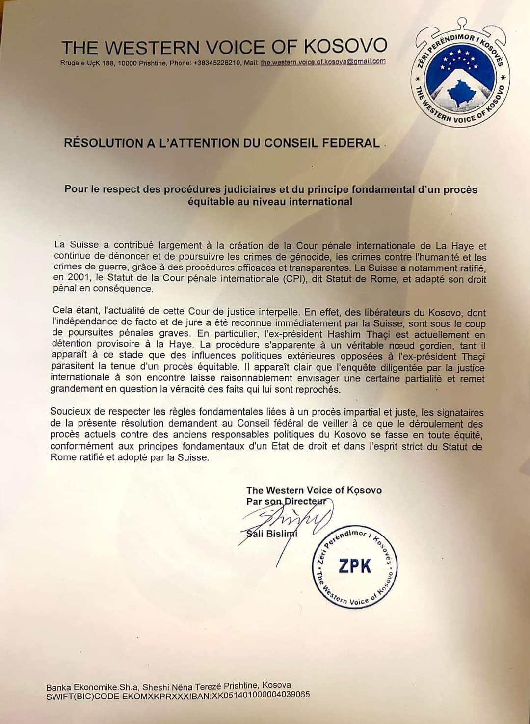 Të shqetësuar për respektimin e rregullave themelore që kanë të bëjnë me një gjykim të paanshëm dhe të drejtë, nënshkruesit e kësaj rezolute kërkojnë nga Këshilli Federal që të sigurojë që gjykimet aktuale kundër ish-liderëve politikë të Kosovës të zhvillohen në drejtësi të plotë, në përputhje me parimet themelore të një sundimi i ligjit dhe në frymën strikte.